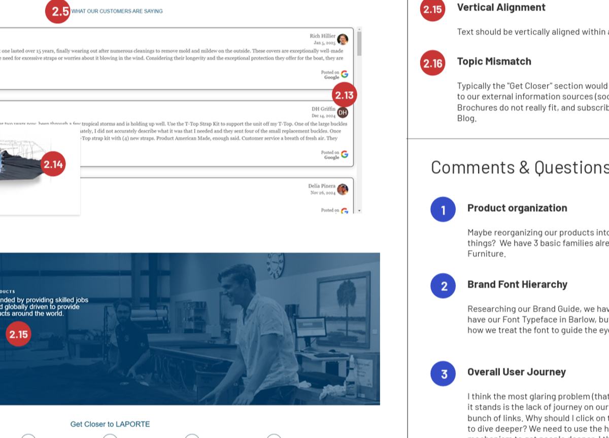 That exercise shaped the proposal. Two phases were scoped (later expanded to three): build the Furnishings site first as the design and tech model, then migrate the Marine site into a proper division hub under a new LaPorte landing experience. Phase one would prove the concept. The rest would follow.