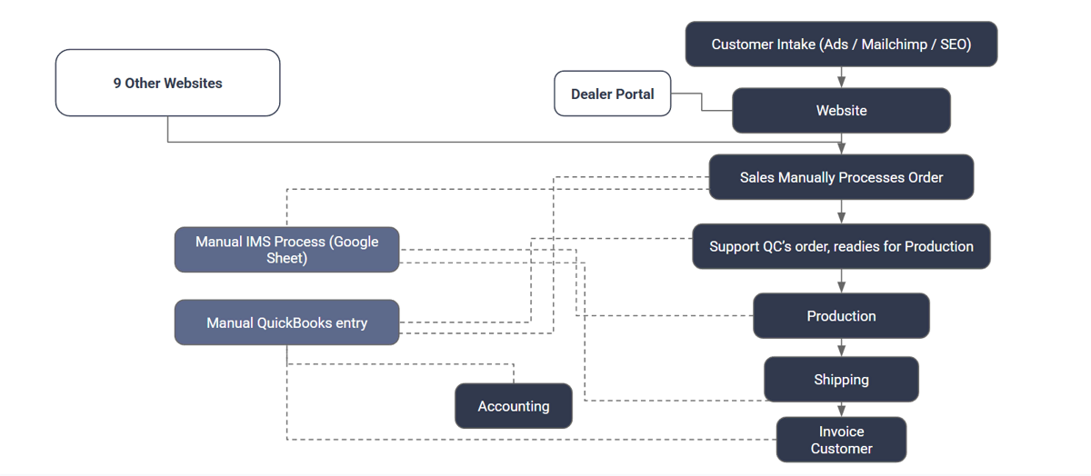 Before a single design decision was made, I mapped how an order actually moved through the company – from the website, through accounting, into production, and beyond. Working cross-functionally with sales and supply chain, I turned that map into something leadership could act on: a clear picture of where complexity was creating cost, and where a better digital infrastructure could recover it.