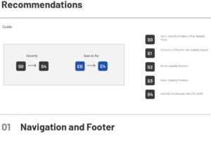 To make the findings actionable, I built a two-axis scoring system – Severity (S0–S4) and Ease to Fix (E0–E4) – and rated every finding against both dimensions. This made triage straightforward: high-severity, easy fixes surfaced immediately as quick wins; high-severity, high-effort items formed the backbone of the rebuild proposal. It gave leadership a way to see the problem not just as a list of complaints, but as a risk-weighted roadmap.