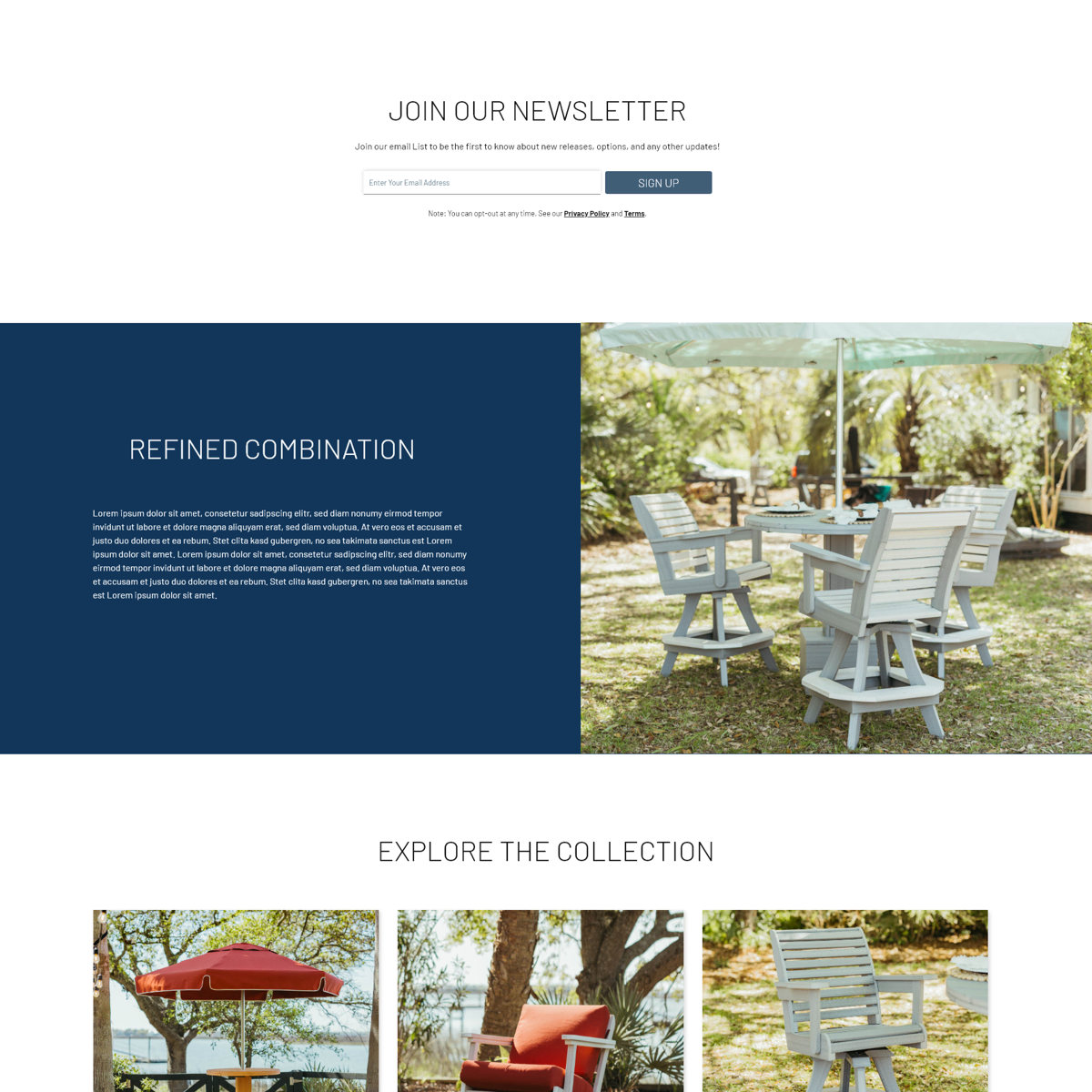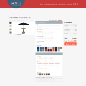 Unlike the Marine side of the business, where configurations are semi-custom and relatively contained, Furnishings products can involve 25+ fabric colorways, multiple table configurations, chairs, umbrellas, and accessories. Across the full catalog, possible combinations run well into the millions. Showing that without overwhelming the customer — or misrepresenting pricing — required a system, not just a layout.